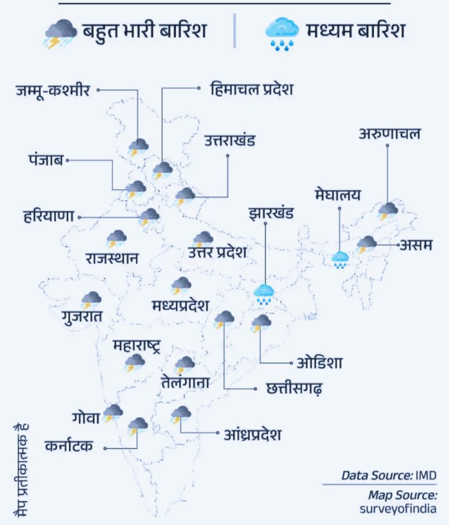 इस मानसून सीजन मैं बारिश उत्तर-पश्चिमी राज्यों में सारे रिकॉर्ड तोड़ रही है। उत्तर पश्चिमी सभी राज्यों में औसत से कहीं ज्यादा बारिश अब तक हो चुकी है और जुलाई का कोटा पहले ही पूरा हो चुका है। अभी भी मौसम विभाग ने कई राज्यों में ऑरेंज अलर्ट और बारिश का रेड अलर्ट जारी किया है।