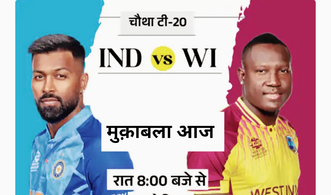 भारत और वेस्टइंडीज के बीच चल रहे t20 सीरीज का चौथा मैच आज खेला जाएगा। आज का मैच अमेरिका के फ्लोरिडा में खेला जाएगा। अब तक तीन मैच हो चुके हैं जिसमे से वेस्टइंडीज 2 मैच जीत चुकी है, और भारत केवल एक, इस सीरीज में कुल पांच मैच होने है। आज चौथा वनडे खेला जाएगा। जिसे जीतना भारत के लिए जरूरी है। अगर भारत को सीरीज जीतने है तो अब भारत को बचे दोनो मैच जीतने होंगे। अब एक भी मैच हारे तो भारत यह सीरीज अपने नाम नहीं कर सकता।