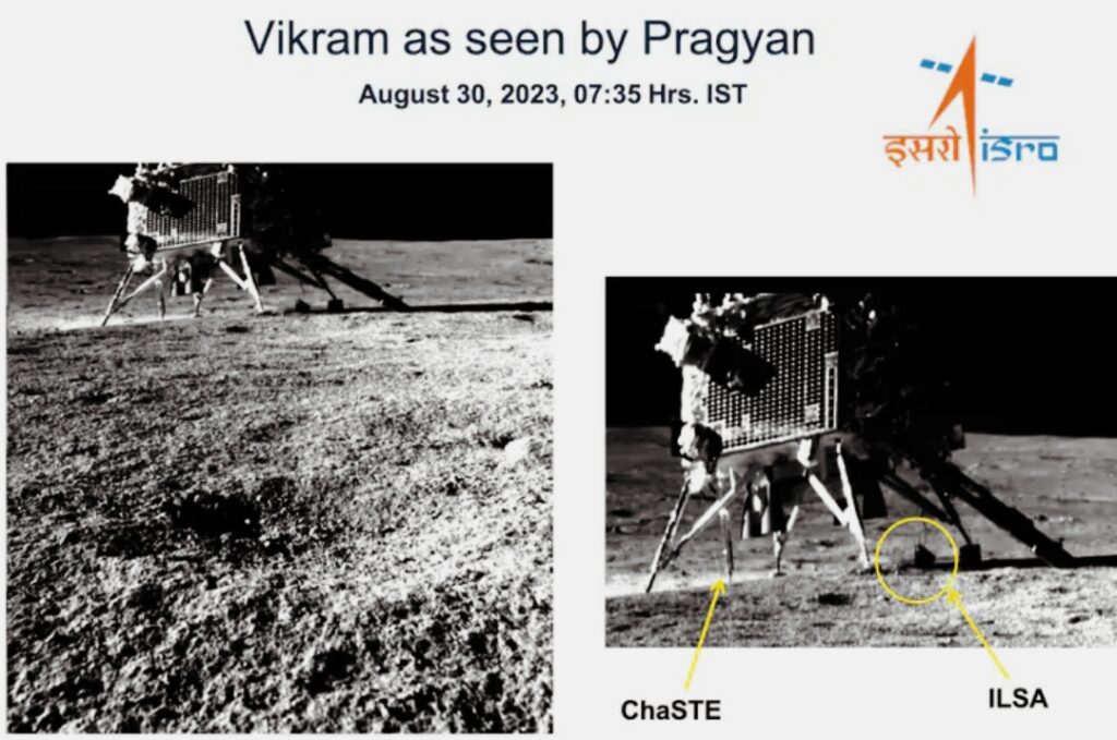 फोटो में दिखाई दे रहा है कि किस तरह लैंडर विक्रम चांद की सतह पर टिका हुआ है और वह वहां क्या कर रहा है लेंडर के साथ लगे पेलोड्स लगातार चांद की सतह पर अपना काम कर रहे हैं वही इसरो ने यह दिखाया है कि लैंडर पर लगे पेलोड्स लगातार कुछ ना कुछ खोज कर रहे हैं वही उसमें दिखाया गया है कि chaSTE पलोड चांद के सतह पर ड्रिलिंग कर रहा है जो कि चांद की सतह तापमान नापने के लिए और उसकी स्टडी करने के लिए लगाया गया है।