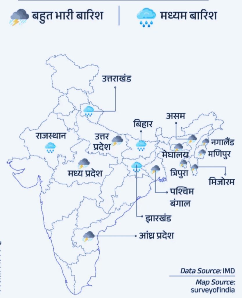वैसे तो मानसून सीजन जाने वाला है लेकिन मानसून जाते-जाते एक बार फिर से देश को भिगोकर जा रहा है देश में फिर से बारिश का दौर एक बार फिर शुरू हो गया है। कई राज्यों में भारी बारिश का दौर जारी है। वही एमपी यूपी और देश के कई राज्यों में आज मौसम विभाग ने बारिश का हाई अलर्ट जारी किया है।