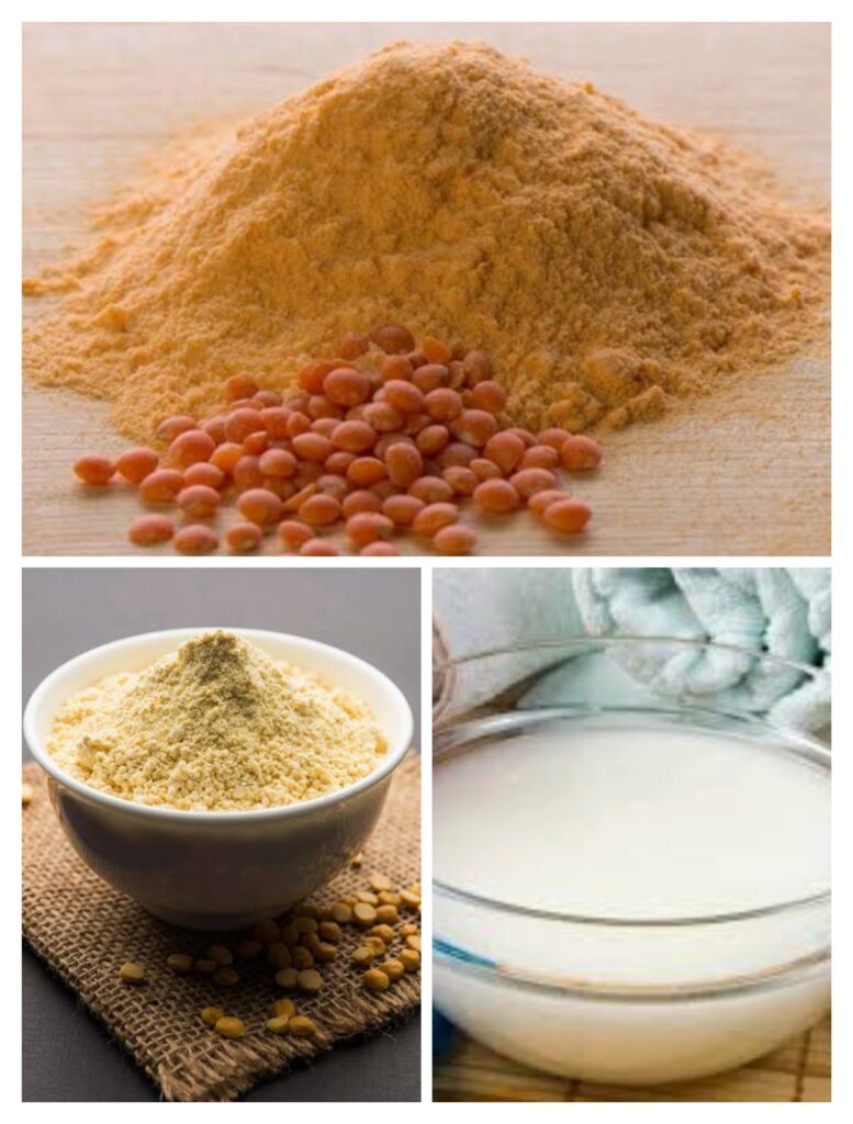 फेस पैक: इस फेसपैक को बनाने के लिए कच्चा दूध ,मसूर दाल पाउडर और बेसन को बराबर मात्रा में मिलाकर एक पेस्ट बना लें ।इसे 2 मिनट के लिए छोड़ दें, उसके बाद फेस को अच्छी तरह साफ करके इस पेस्ट को अपने फेस पर अच्छी तरह अप्लाई कर ले। फेस पैक को नेचुरल तरीके से सुखाने के बाद आप इसे नॉर्मल पानी से थोड़ा मसाज करते हुए इसको धो लें । इस नुस्खे को आप हफ्ते में चार बार या तीन बार अप्लाई करें इसके बाद एक महीने में ही आप देखेंगे कि आपकी फेस की स्किन बच्चों की तरह सॉफ्ट हो गई है और फेस पर चमक आने लगेगी।