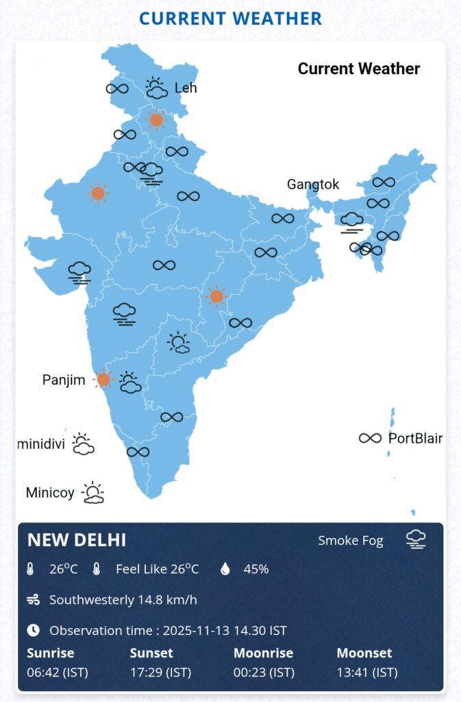 भारत मौसम विज्ञान विभाग ने चेतावनी जारी करते हुए कहा है कि पश्चिमी मध्य प्रदेश, छत्तीसगढ़ और राजस्थान में 15 नवंबर तक शीत लहर की स्थिति बनी रह सकती है। वहीं, तमिलनाडु में 12 नवंबर को, केरल और पुडुचेरी में में 12-13 नवंबर को कई स्थानों पर भारी से बहुत भारी वर्षा दर्ज की जा सकती है। राष्ट्रीय राजधानी के कुछ हिस्सों में धुंध की परत छाई है। केंद्रीय प्रदूषण नियंत्रण बोर्ड के अनुसार, एक्यूआई 400 से अधिक दर्ज किया गया है। IMD के अनुसार, आज राजधानी में हल्का कोहरा छाया रहेगा और आसमान साफ रहेगा। उत्तर प्रदेश में मौसम करवट ले रहा है। दिन में तेज धूप निकलने के कारण मौसम में कुछ खास ठंड महूसस नहीं होती है लेकिन रातें ठंडी जरूर हो रही है। कानपुर शहर और इटावा में तापमान 10℃ से नीचे लुढ़क गया है। हालांकि मौसम विभाग की ओर से कोई अलर्ट नहीं जारी किया गया है। अब मौसम विभाग ने तीन राज्यों में शीतलहर का अलर्ट जारी किया है। साथ ही तमिलनाडु, केरल और पुडुचेरी में अगले दो दिनों तक भारी बारिश होने की संभावना जताई है। वहीं दिल्ली-एनसीआर में प्रदूषण की स्थिति लगातार गंभीर के करीब बनी हुई है। बिहार में कड़ाके की ठंड ने दस्तक दे दी है। राज्य भर में न्यूनतम तापमान में गिरावट दर्ज की गई है, जिससे सुबह और देर रात में लोगों को खास तौर पर ठंड का अहसास हो रहा है।